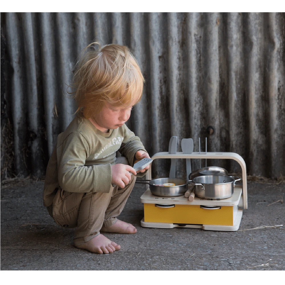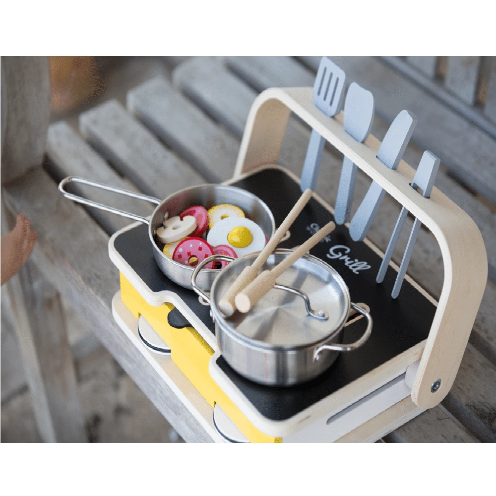 This kitchen comes with all the trimmings – metal frying pan and sauce pan, tongs, knife, spatulas, it even comes with skewers and vegetables to inspire the ultimate creativity! Move the utensil holder when it’s time to tidy up and use as a handle for storage / travel.