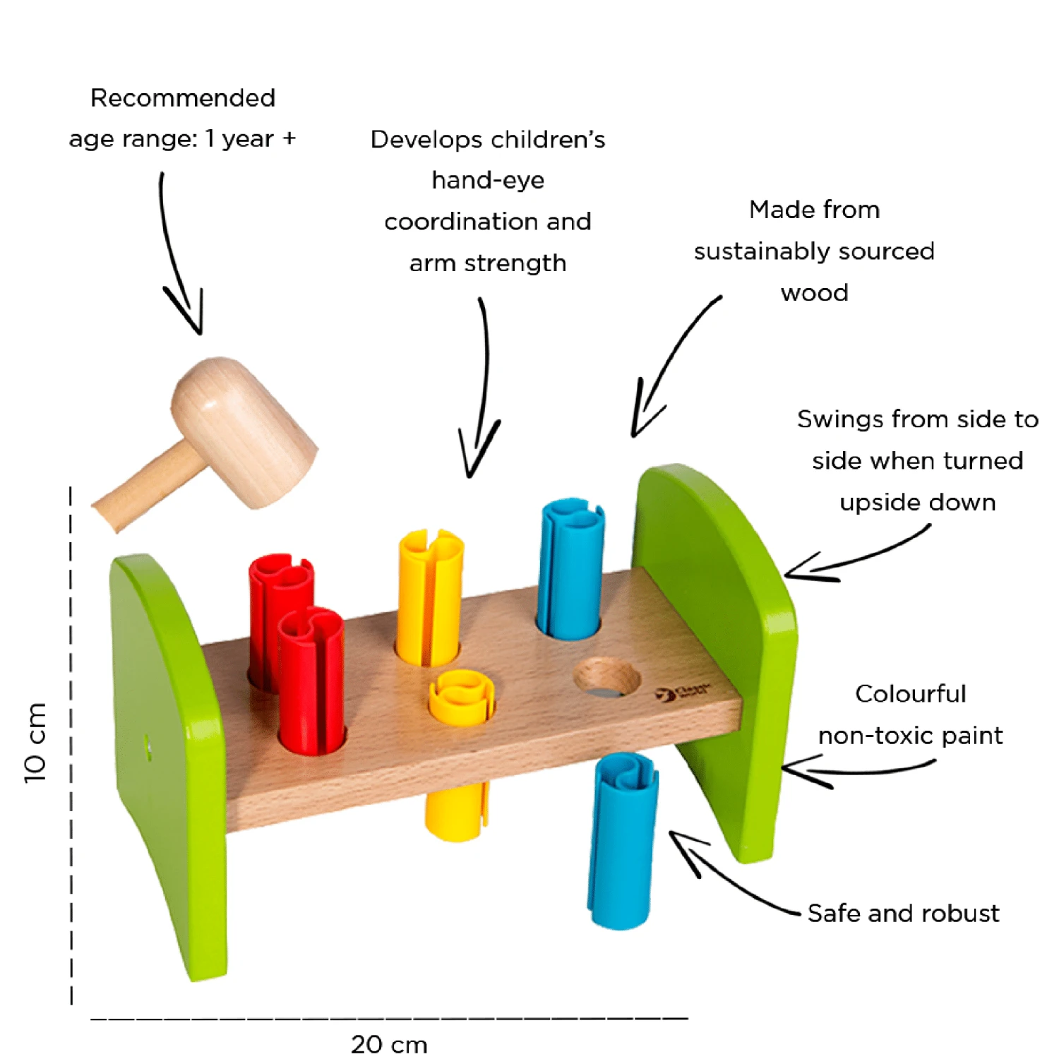 This colourful Classic World Hammer and Peg Game is great and colourful. With 6 pegs and a hammer will develop children’s hand-eye coordination and arm strength. It swings from side to side when turned upside down, making the game more fun and challenging.