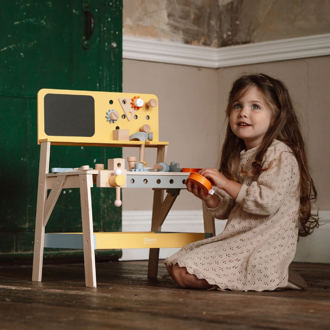 - A brilliantly constructed tool bench kitted out with all the wooden toys your little one could need to construct something wonderful