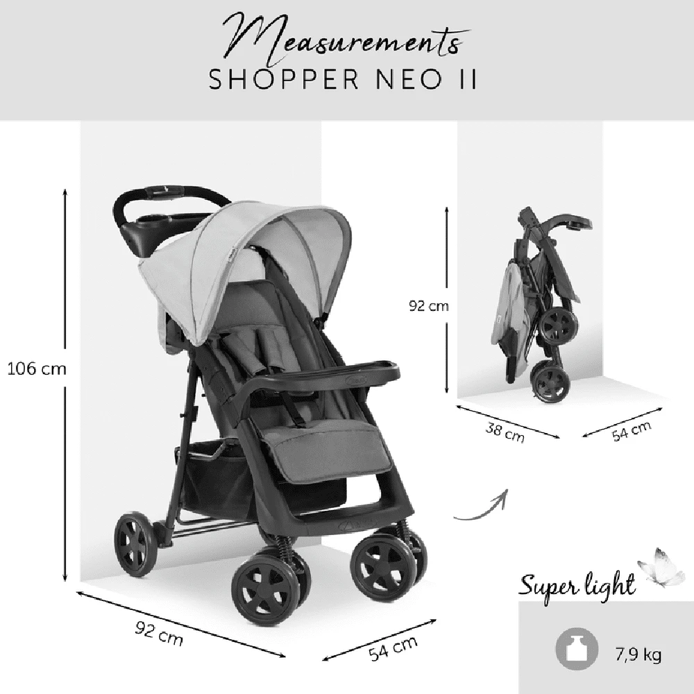 Hauck Shopper Neo II Grey is the perfect companion for shopping and travel. It can be unlocked and folded down quickly and compactly with just one hand, leaving the other one free for your child. It skilfully manages buses, trains, and stairs. Its folded dimensions are so compact that the Shopper Neo II can easily be stored in any boot.