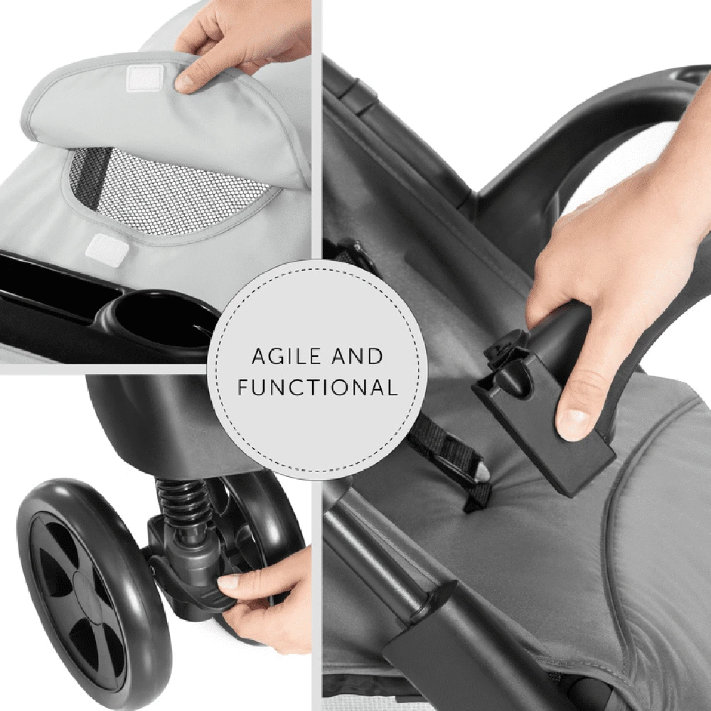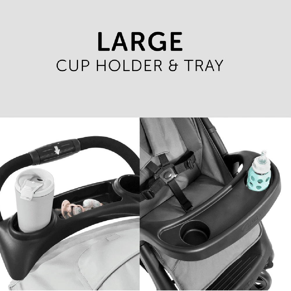 The buggy’s big wheels guarantee pure driving fun, while it winds its way easily through busy pedestrian areas thanks to its swivelling and lockable front wheels. Keep bottles, refreshments and bits and pieces on the two accessories trays. Store your shopping or baby accessories in the large basket.