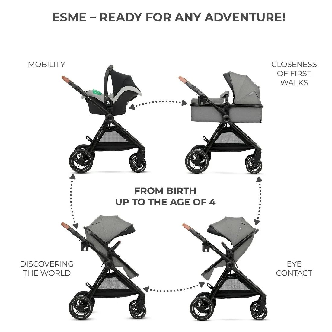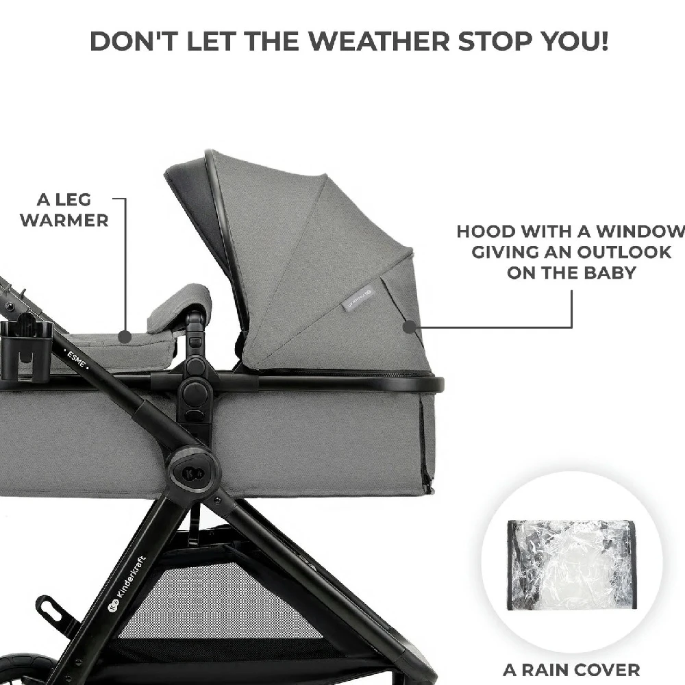 Kinderkraft ESME Travel System Grey is a multifunctional 3 in 1 baby pushchair that will amaze you with its functionality combined with exceptional design. The subdued color scheme, meticulous finish, and eco-leather elements will make your daily walks even more enjoyable.