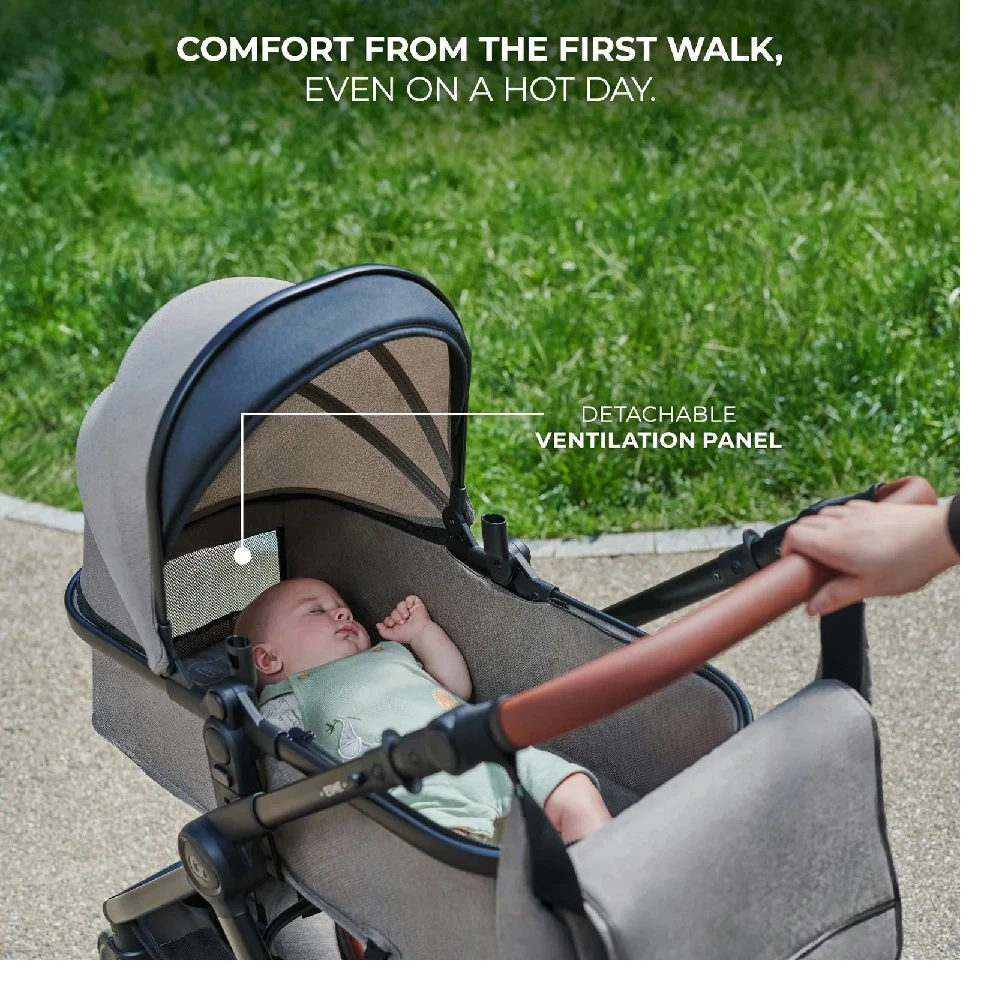 The pushchair features a large carrycot with a ventilation panel that can easily be transformed into a stroller seat. This 2 in 1 solution saves you plenty of storage space when itβs time for your little one to switch to the stroller seat.