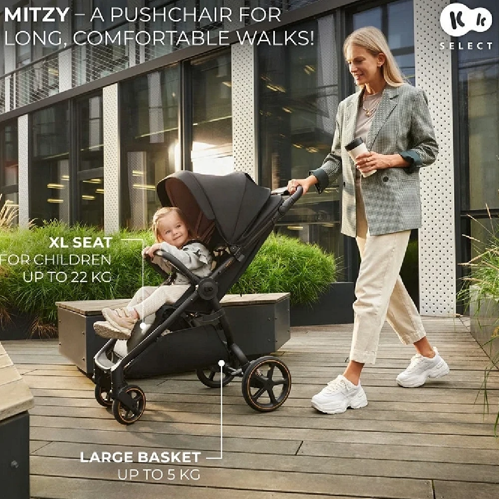 The Kinderkraft Mitzy Pushchair Ink Black is perfect from the first months of life and can carry a load of up to 27 kg*. It is equipped with a long XL seat that can accommodate even an older preschooler. Your child will be comfortable both during short walks and longer trips. * Maximum child weight: 22 kg, maximum basket load: 5 kg.