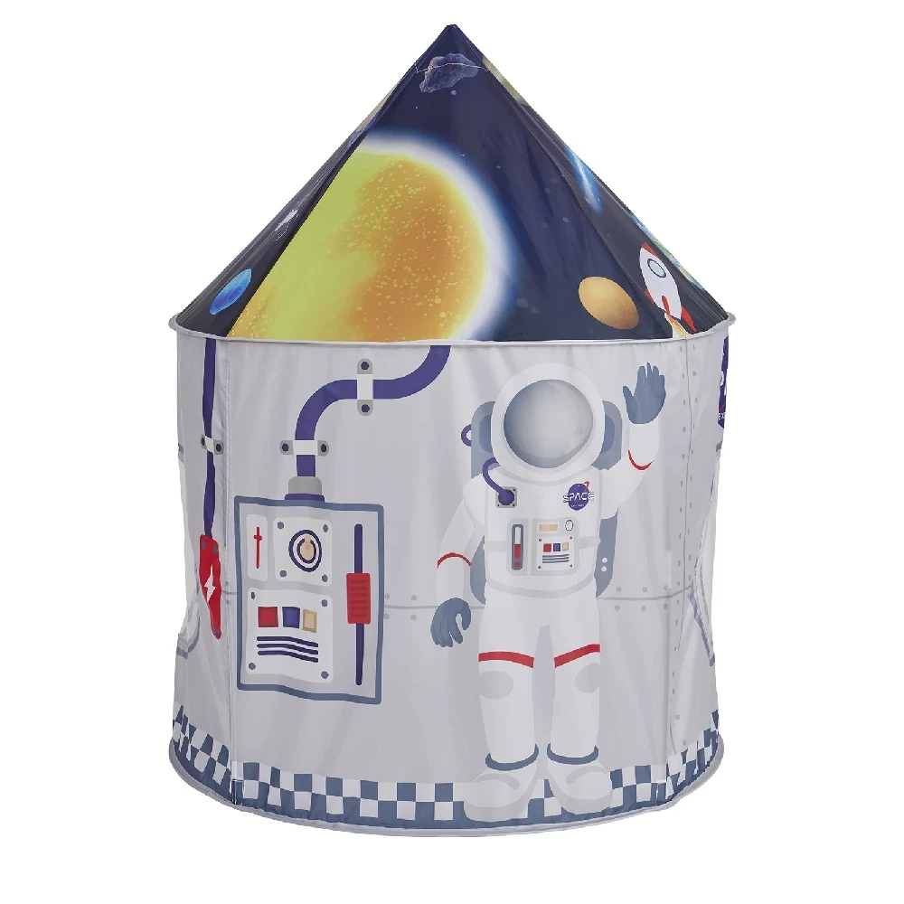 - Kids Space Play Tent is made of polyester and fibreglass pole with steel wire, and it comes flat packed with easy-to-follow assembly instructions. Item includes storage bag for when you want to fold it away.