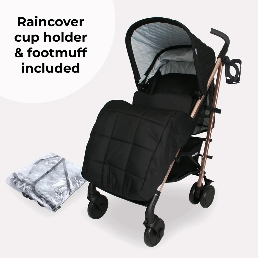 - Raincover, footmuff and cup holder included