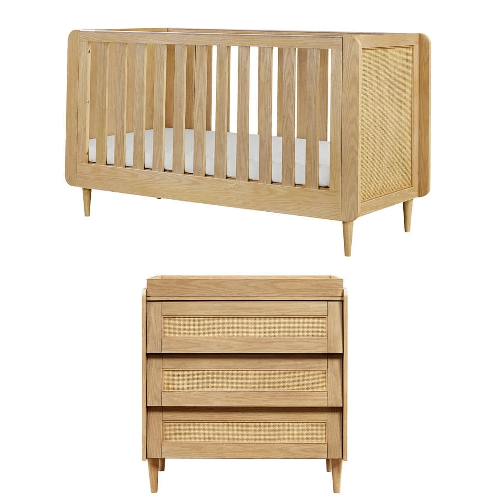 Crafted with a harmonious blend of rattan and wood, our Tutti Bambini Japandi Mini 2 Piece Room Set – Light Oak combines rattan and wood’s natural beauty with clean lines, capturing a spirit of tranquillity and balance. This set includes a space-saving cot ( L135 x W65 x H90 cm) and a chest changer, offering ample storage for your growing family.
